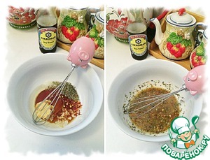 Из лимона выжать сок, чеснок пропустить через пресс. Соединить все ингредиенты для заправки в мисочке и взбить венчиком.