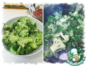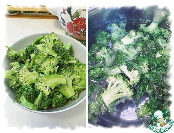 Брокколи помыть, разобрать на соцветитя и нарезать слайсами. Бросить в кипящую воду на одну минуту (не больше). Брокколи должны оставаться хрустящими. Воду слить и полностью остудить. Eсли вы любите сырые брокколи, то можно салат сделать с сырыми и не опускать их в кипяток.