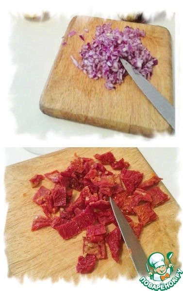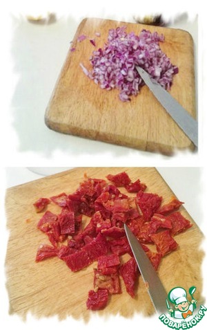 Лук мелко порезать. Вяленые томаты порезать на небольшие кусочки.