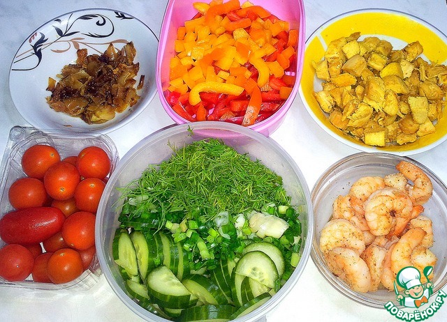 Ингредиенты для «Овощной салат с курицей и креветками»: