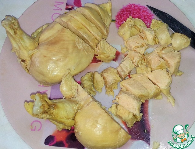 Курица варенная в солёной воде от 3 - х до 5 минут. Затем я её нарезала кубиками и немного обжарила на оливковом масле с добавлением кайенского перца и куркумы.