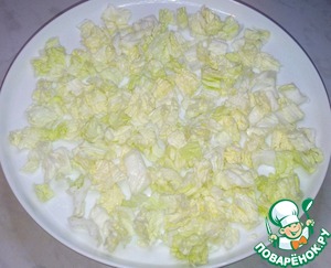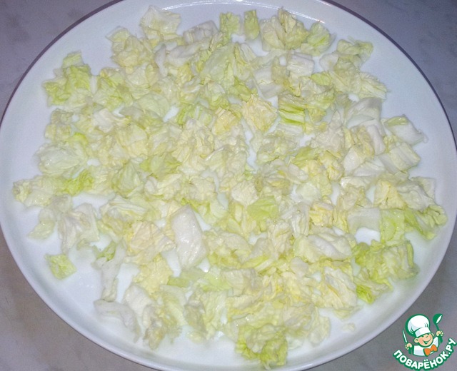 Пекинскую капусту мелко нарезала и насыпала на основание большой тарелки.