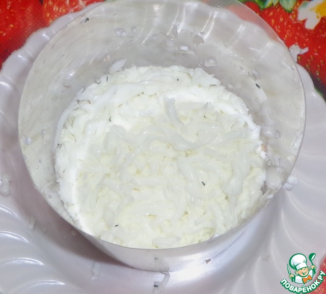 Отварные яйца остудить и разделить на белок и желток. Белок натереть на крупной терке и выкладываем слой из белка. Заправка.
