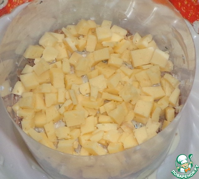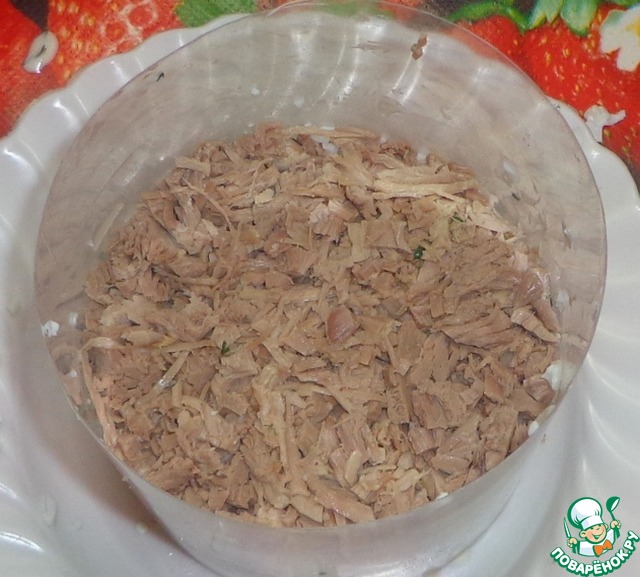 Отварное и охлажденное мясо утки (мясо можно брать любое) мелко нарезать. Выкладываем в форму для салата слой из мяса. Поливаем немного заправкой.