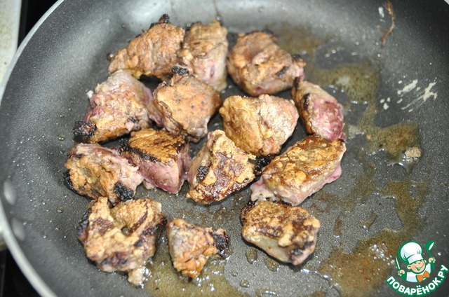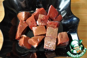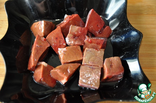 Печени даём оттаять, удаляем плёнку, режем средними кусочками.
