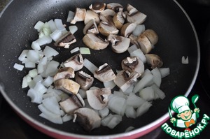 Шампиньоны моем, обсушиваем, мелко режем и кладём к грибам. Обжариваем, помешивая, 5 минут.