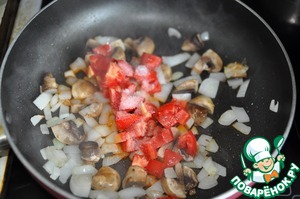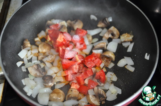 Кладём мелко нарезанный помидор, солим, перемешиваем.