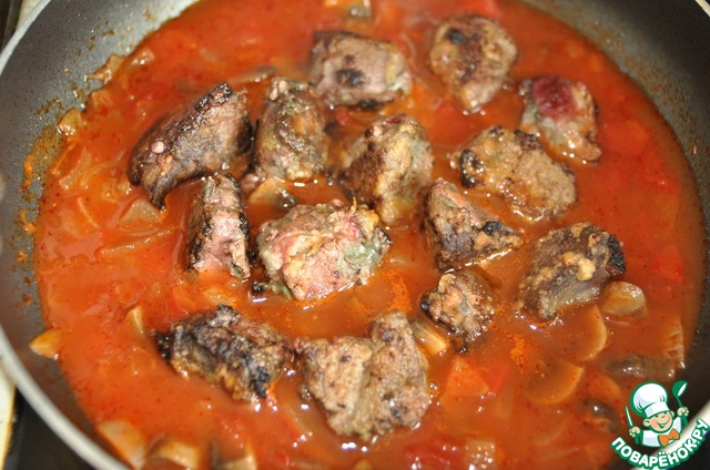 Добавляем обжаренную печень и тушим до загустения соуса около 15 минут.