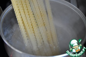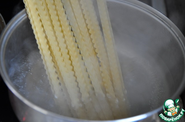 Берём любые макаронные изделия, я выбрала феттучини. Варим согласно инструкции на упаковке.
