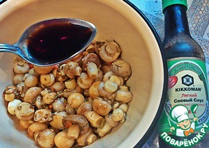 В тарелку с шампиньонами налить соевый соус Kikkoman, перемешать и оставить мариноваться на 30 минут. Затем шампиньоны нарезать мелкими кубиками и разделить на две части.