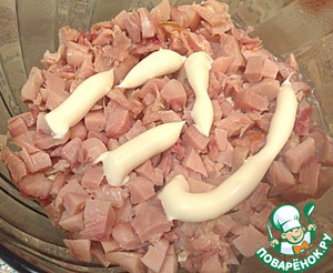 Копченый окорочок отделить от кости, мелко нарезать, положить сверху на слой шампиньонов и обмазать майонезом.