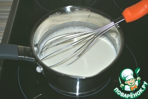 Оставшееся молоко смешиваем со сметаной, сахаром, ванилином, ставим на средний огонь. Вводим крахмал, непрерывно мешая, доводим до кипения. Крем должен загустеть. Снимаем с плиты и ставим остывать, время от времени помешивать.