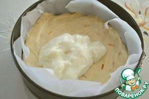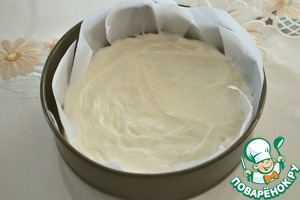 Тесто наше подошло через 2 часа если оно на закваске или через 40 мин. если на дрожжах. Форму со съемными бортами застелить пергаментом и равномерно распределить тесто по дну формы (26 см, можно взять форму немного больше).