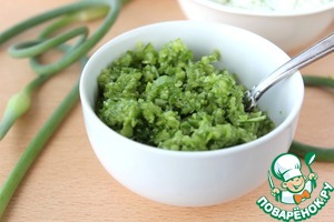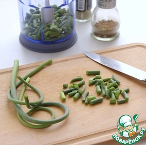 Молодые стрелки чеснока вымыть, обсушить, нарезать на небольшие кусочки.