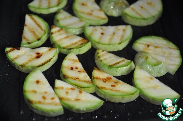 Сковороду-гриль смазываем маслом кисточкой (1 ст. ложка) и обжариваем по очереди все овощи до "красивых полосочек".