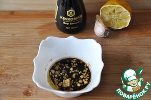 Берём соевый соус ТМ "Киккоман", добавляем мёд, оливковое масло, бальзамический уксус, сок лимона, мелкорубленный чеснок. Перемешиваем вилкой. -