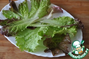 Листья салата моем, обсушиваем бумажным полотенцем и кладём на сервировочное блюдо.