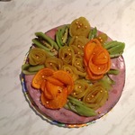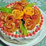 Готовые розы и листики укладываем красиво на торт так, как Вам подскажет фантазия. Розы с апельсина более капризные и неустойчивые, поэтому к ним лучше сразу по бокам уложить яблочные розы для поддержки. Розы слегка (только аккуратно, чтоб не испортить) вдавить в крем.