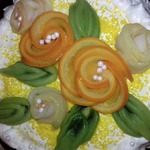 Яблочные дольки выложить на доску так, чтоб края слегка ложились друг на друга, затем, начиная с правой стороны, свернуть рулетик. Для каждой розочки нужно использовать 6 яблочных долек. Кружочки апельсинов разрезать пополам и так же свернуть рулетиком, используя 5 долек апельсина. Киви порезать на четвертинки и вырезать уголками по принципу лебедя из яблок. С каждой стороны делаем надрез, не дорезая где-то по 1 см и получается уголок. Затем аккуратно в сторону выдвинуть уголки и получаем такой лепесток.