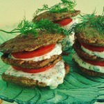 Берeм один печeночный оладушек, намазываем соусом, кладeм помидорку, закрываем другим , снова намазываем соусом, сверху опять помидорку, и опять соус.