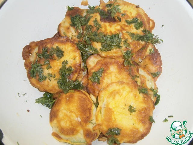 Получится такой цельный, большой "блин" из кабачков в кляре. Из них можно удобно и быстро собрать "кабачковый торт", промазав слои густой сметаной с мелкорубленой зеленью и чесноком.