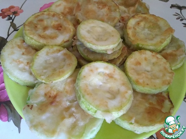 Вспомним мы сегодня снова, наши блюда с кабачками! Может быть они не новы, но всегда любимы нами! Вот один простой рецепт! Кабачки в сметанном кляре! В нем есть маленький секрет, скрыт в чесночном маринаде! Очень сочно, очень нежно, вкусно получается! И надеюсь, что конечно вам друзья понравятся! Угощайтесь дорогие! Кабачки всегда прекрасны! Хороши они любые! Для фигуры не опасны! Калорийность кляр конечно все же блюду придает.. Жить нельзя с диетой вечно, пусть немного подождет!