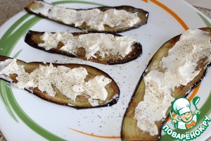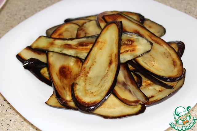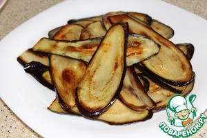 Баклажаны нарезала тонкими полосками вдоль, немного посолила, через 30 минут обмыла холодной водой, обсушила и обжарила с двух сторон в небольшом количестве растительного масла.