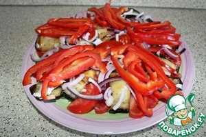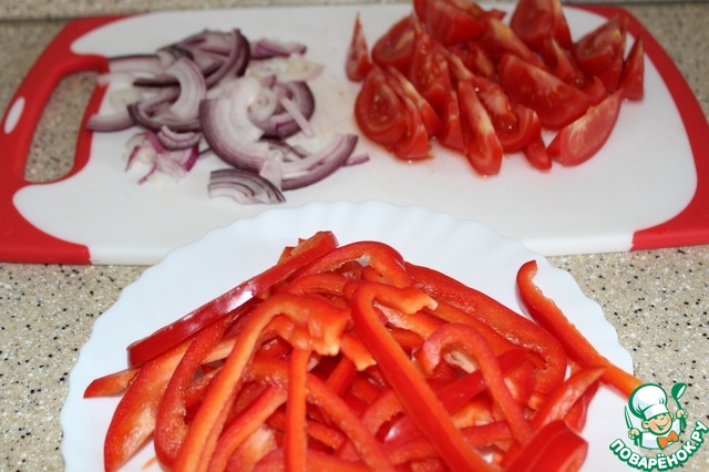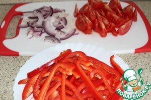 Нарезала лук четвертинками колец, перец - соломкой, помидор - тонкими ломтиками.