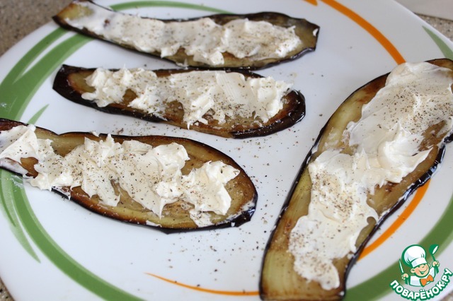 На баклажаны намазала творожный сыр, посолила, поперчила. Свернула рулетики, скрепила зубочистками.