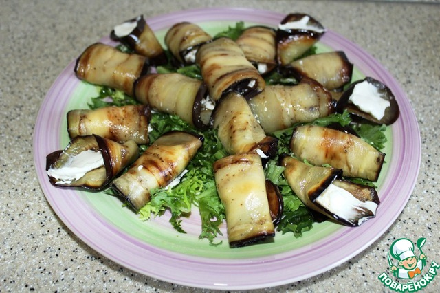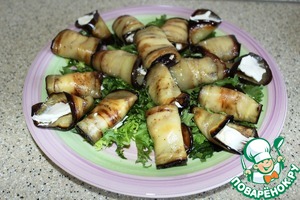 Сверху на листья баклажановые рулетики.