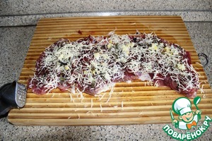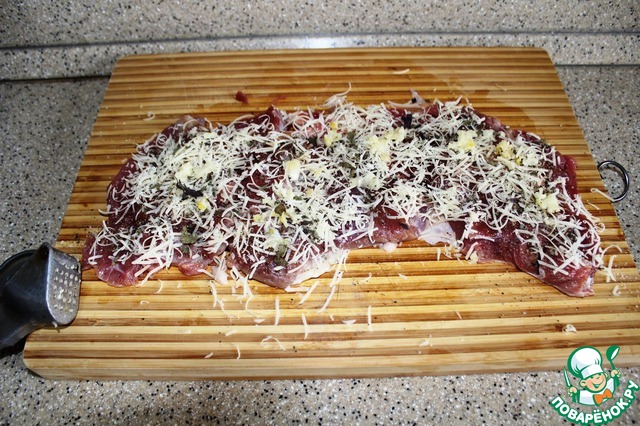 • Пока содержимое сковороды остывает. Голень разрезала поперек, развернула, посолила, поперчила, выдавила через чесночницу чеснок, сбрызнула бальзамическим уксусом (прекрасно подошел бы белый, но увы нет) и посыпала тертым сыром.