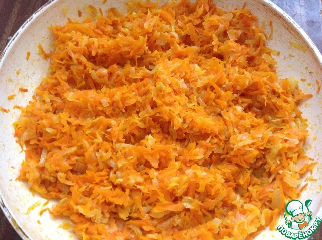 Ставим сковородку на огонь, наливаем масло, пока греется режем лук, бросаем в сковородку, пока он слегка обжаривается, морковку натираем на крупной терке, и добавляем к луку. Убавляем огонь. Если нужно, добавляем еще немного масла. Потом, можно добавить чуть водички и потушить, горелые овощи нам ни к чему. Трем чеснок на мелкой терке (можно через да вилку), если овощи готовы, добавляем чеснок, перемешиваем и выключаем. Убираем охлаждаться.