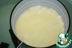 Медленно, за 15-20 минут нагреть до 38 градусов. Помешивать сначала аккуратно, потом энергичнее. При температуре 38 градусов помешивать еще 20 минут. Оставить на 20 минут, перемешивая каждые 5 минут.