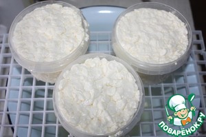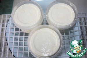 Удалить сыворотку (не выливать). Сыр выложить в формы, хорошо примяв рукой. На Кипре в качестве форм используют небольшие корзинки, у меня это - полипропиленовые баночки по 280 мл. В баночках паяльником сделаны частые мелкие отверстия. Оставить самопрессоваться.