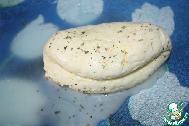 Вынуть сыр из сыворотки, погрузить на несколько секунд в холодную воду, положить на стол и немного расплющить рукой.