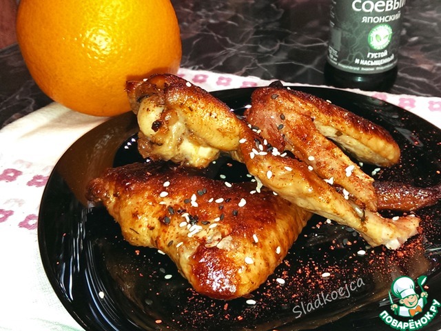Смешать сок апельсина с соевым соусом и полить крылья.