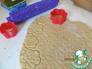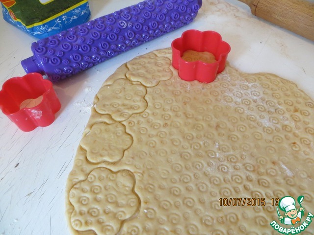 Достаем тесто из холодильника, раскатываем слой толщиной 0,5 - 1 см. Чем толще, тем мягче получится печенье. Для любителей хрустящего - раскатывайте тоньше. Я для красоты использовала фигурную скалку для мастики.