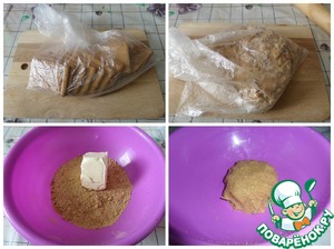 • Печенье складываем в полиэтиленовый пакет и измельчаем с помощью скалки. (Можно измельчить в блендере или пропустить через мясорубку). Крошку высыпаем в чашку, добавляем сливочное масло. Замешиваем "тесто".