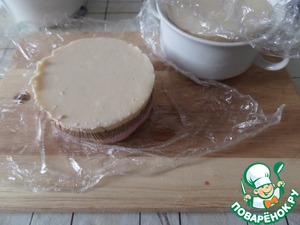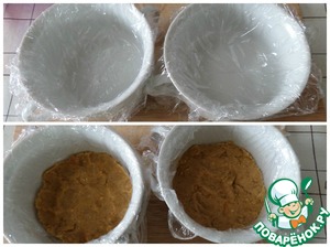 • Формы (у меня бульонницы) застелить пищевой пленкой. От "теста" отщипываем кусочек, кладем в форму, разравниваем руками. Ставим формы в холодильник на 20 минут.