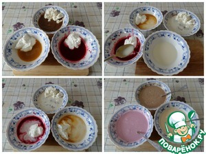 • Творог делим на три части и раскладываем в чашки с банановым пюре и отжатыми соками. Добавляем молочно-желатиновую смесь и оставшийся сахар (к малиновому и абрикосовому сокам). Хорошо перемешиваем.