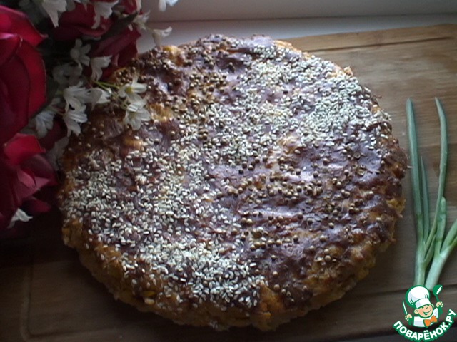 Форму смазать маслом и присыпать мукой. Выложить массу в форму, разровнять. Присыпать сверху тертым сыром и семенами кунжута. Мне нравятся семена кориандра тоже.