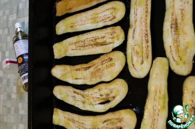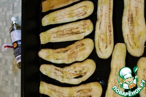 На противень набрызгала немного масла, уложила баклажановые пластины, спрыснула маслом сверху (можно помазать сверху кисточкой или просто пальцами).