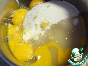В небольшой кастрюльке соединяем желтки, сахар, сок и цедру, перемешиваем и ставим на водяную баню