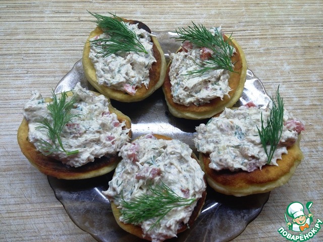 [+5]Я по-быстрому к ужину салатиком начинила тарталетки из слоёного теста. Немного осталось, завтра утром батон намажу. Два в одном и салат и намазка для бутербродов.