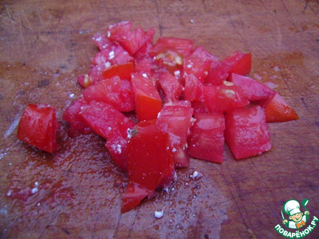 Помидор нарезать мелкими кубиками. Помидоров можно взять больше по своему вкусу.