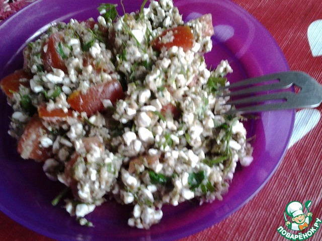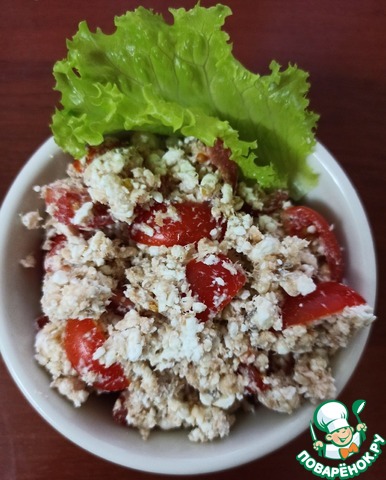 Очень вкусный и очень быстрый творожный салатик. Когда гости на пороге, то за десять минут можно сотворить очень оригинальное угощение. А еще это намного полезнее тяжелых майонезных салатов. Пока есть свежие помидорчики я часто себя балую таким салатом.
