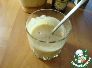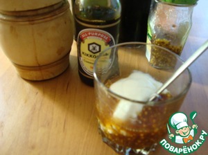В него кладём соевый соус, уксус, мёд, горчицу и всё перемешиваем.