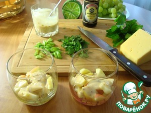 На яблоки выкладываем сельдерей, наливаем ложкой заправку. Затем сыр мелким кубиком, опять-заправку. Виноград-верхний слой и поливаем оставшейся заправкой.
