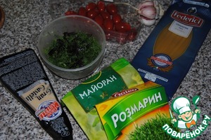 Через минут 5 после закипания пасты, на разогретую сковороду вливаем масло, уменьшаем огонь и добавляем порубленный базилик. Через полминуты помидоры порезанные пополам. Быстро обжариваем. Далее рубленный чеснок, розмарин и майоран (не обжариваем, а то чеснок даст горечь) и сразу кладем в сковороду спагетти (не откидываем на дуршлак) плюс 2-3 ст. л. воды из-под пасты. Оставляем на сковороде буквально на 1-2 минуты.