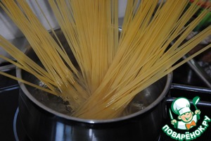 Отвариваем спагетти (см. время варки на упаковке минус 2 минуты) до состояния альденте.
